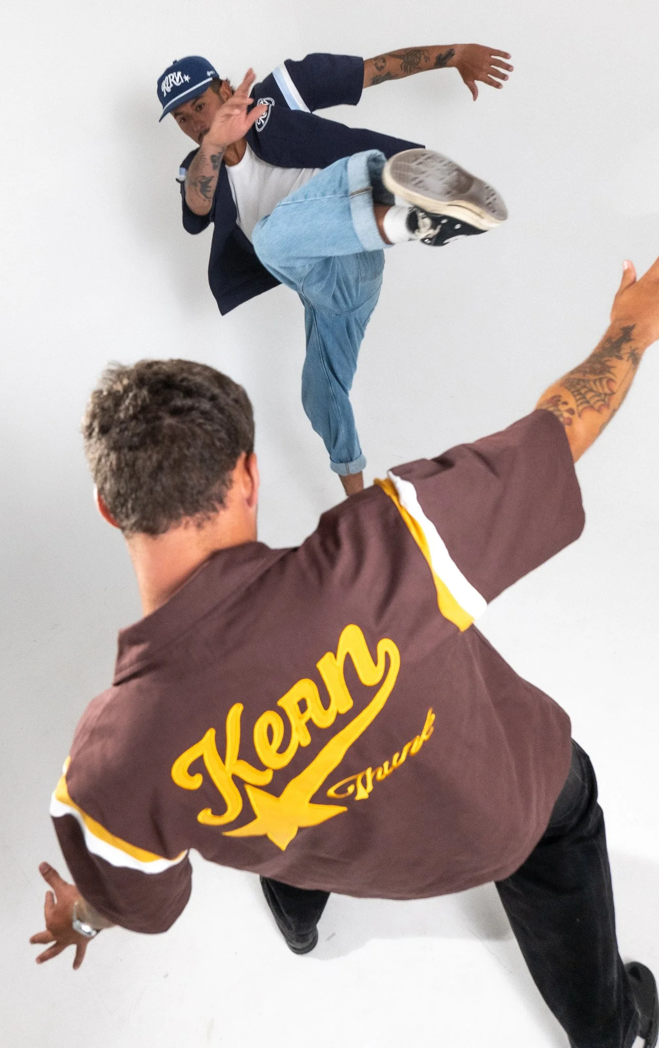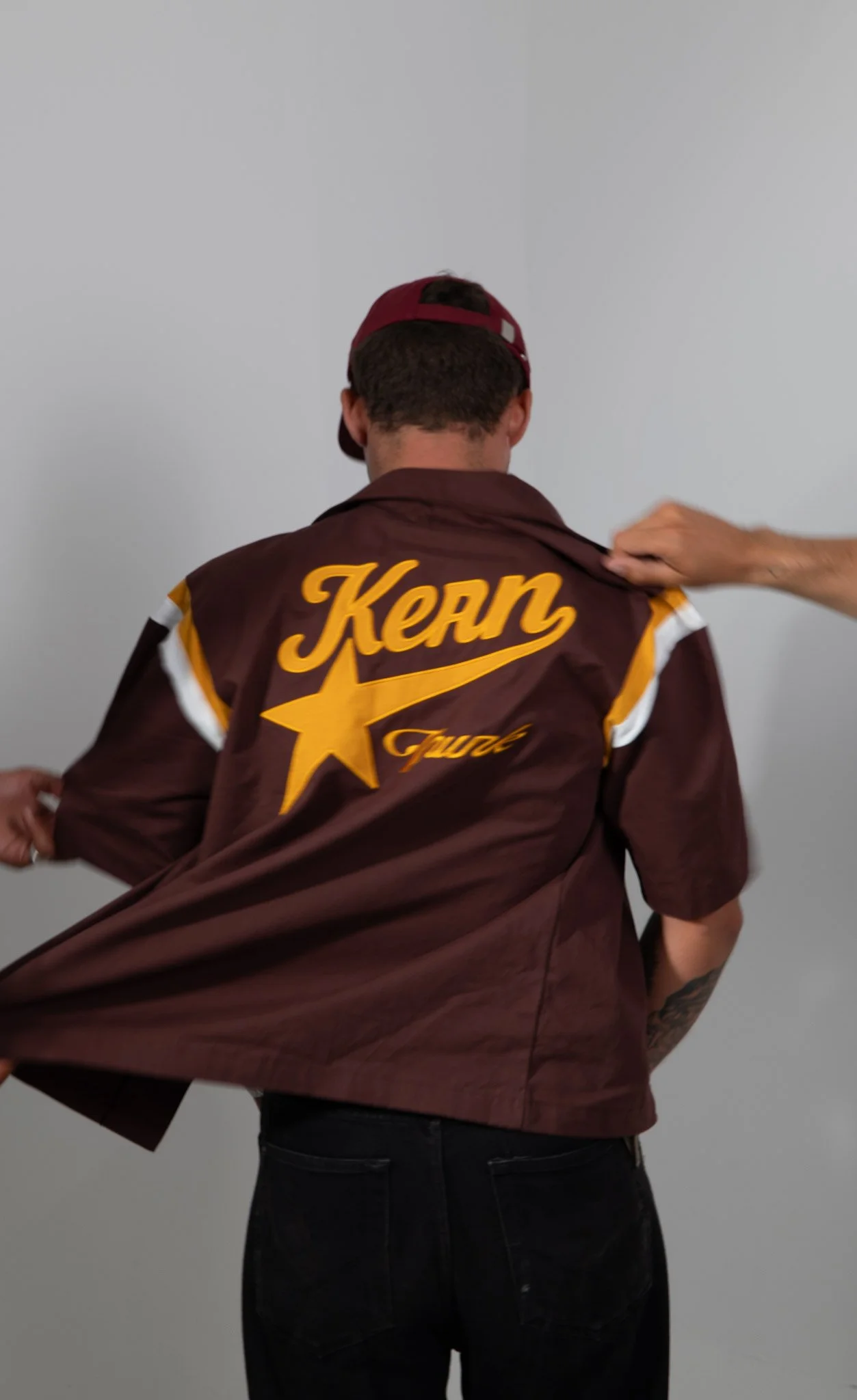The deep cherry brown body pairs perfectly with golden yellow and crisp white shoulder stripes, giving off a sun-faded, vintage-league energy. On the front, a KERN embroidered patch nods to old-school bowling teams, while the back steals the show with its oversized Kern script, shooting star, and Thunk branding in rich golden tones.